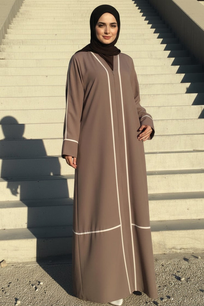 Inspired by the calm hues of desert mornings, the Desert Dawn Line Abaya blends simplicity with modern elegance. Designed in a warm desert-brown shade, this abaya features clean, minimal white line detailing along the front, sleeves, and lower panel—creating a structured yet graceful look.