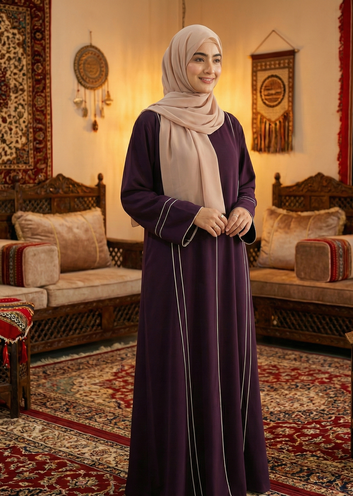 Elevate your modest fashion collection with this sophisticated Dust & Plum abaya, a timeless piece that seamlessly blends elegance with comfort. The carefully curated color palette—soft dust tones paired with rich plum accents—creates a refined aesthetic suitable for both everyday wear and special occasions. Crafted with attention to detail, this abaya features a flowing silhouette that flatters all body types while maintaining the grace and modesty you seek. The premium fabric drapes beautifully, offering both breathability and durability for year-round wear. Perfect for those who appreciate understated luxury and contemporary Islamic fashion, this abaya is an essential addition to any wardrobe.