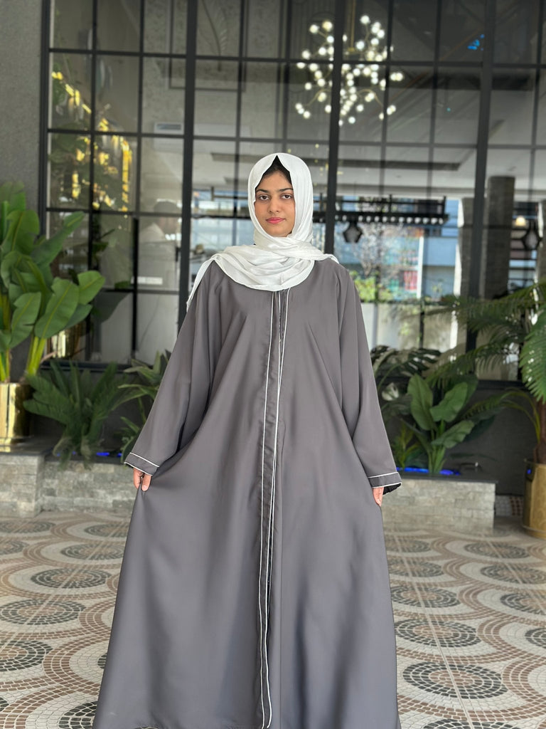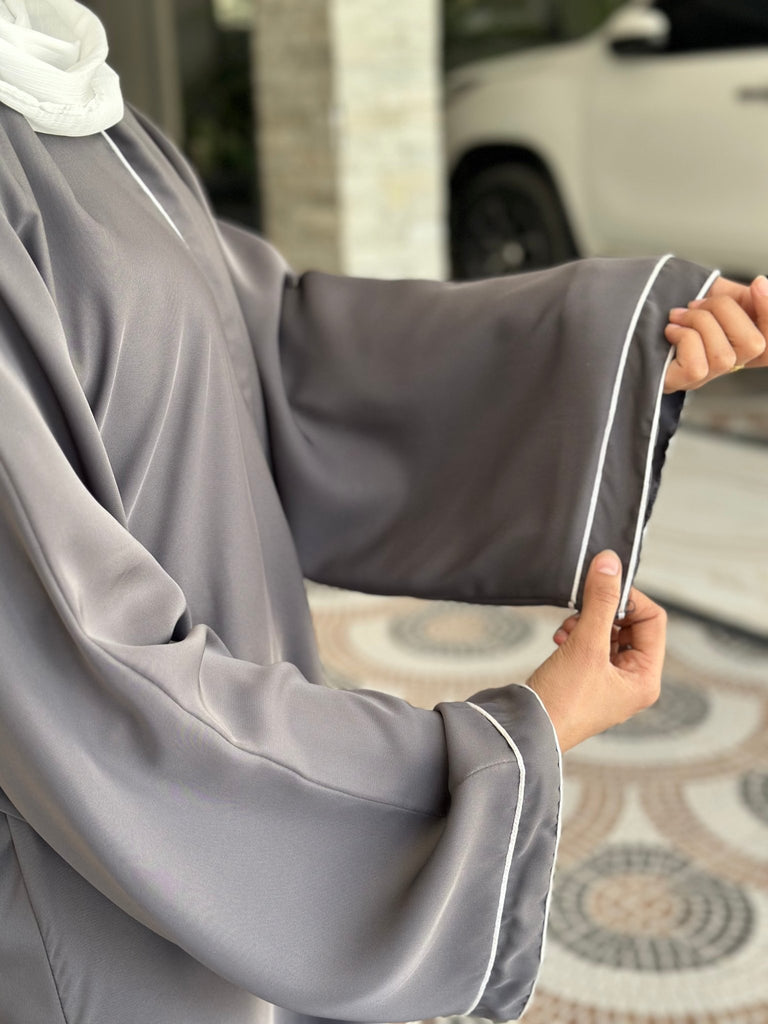 - A minimalist and refined grey abaya with fine white piping for a sleek and polished look.