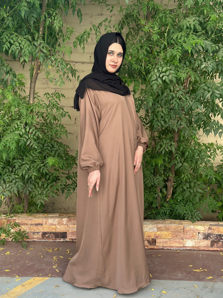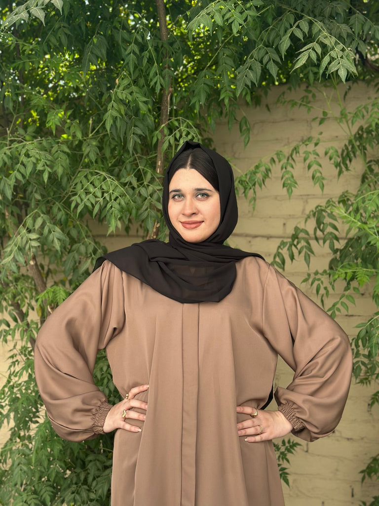 This front open abaya is both sophisticated and unique, featuring elastic sleeves and a beautifully pleated back. It offers a modern twist on a classic design, providing a stylish alternative to plain abayas and is perfect for making a statement.