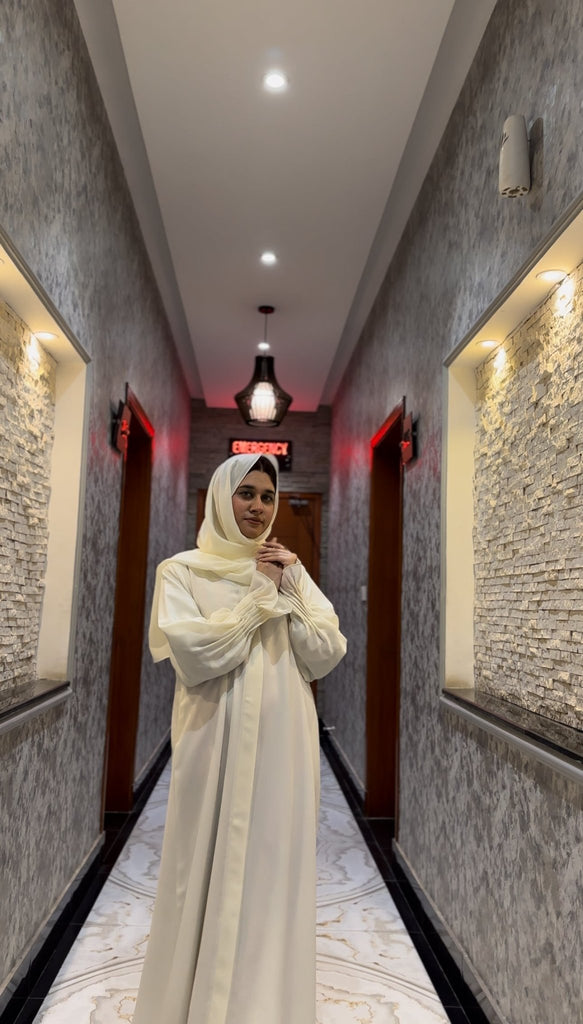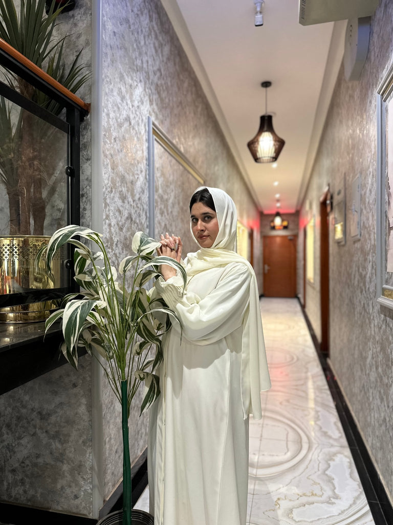 "Exude sophistication with the Ivory Grace Abaya, meticulously crafted from premium off-white Zoom Nidah fabric. This elegant piece features a timeless design that flows gracefully, offering unmatched comfort and style. Perfect for any occasion, the Ivory Grace Abaya embodies the essence of modern modesty with a touch of luxury."