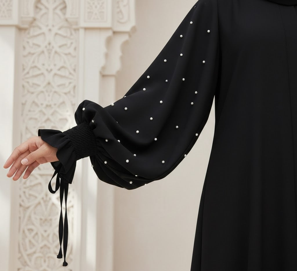 Elevate your modest fashion collection with this sophisticated black abaya, meticulously crafted with elegant pearl embellishments adorning the sleeves. The timeless black silhouette provides versatile styling options for any occasion, while the pearl detailing adds a refined touch of luxury and femininity. Designed with comfortable, flowing sleeves that balance coverage with graceful movement, this piece seamlessly transitions from everyday wear to special events. The premium construction ensures durability and lasting elegance, making it an essential investment in your wardrobe.