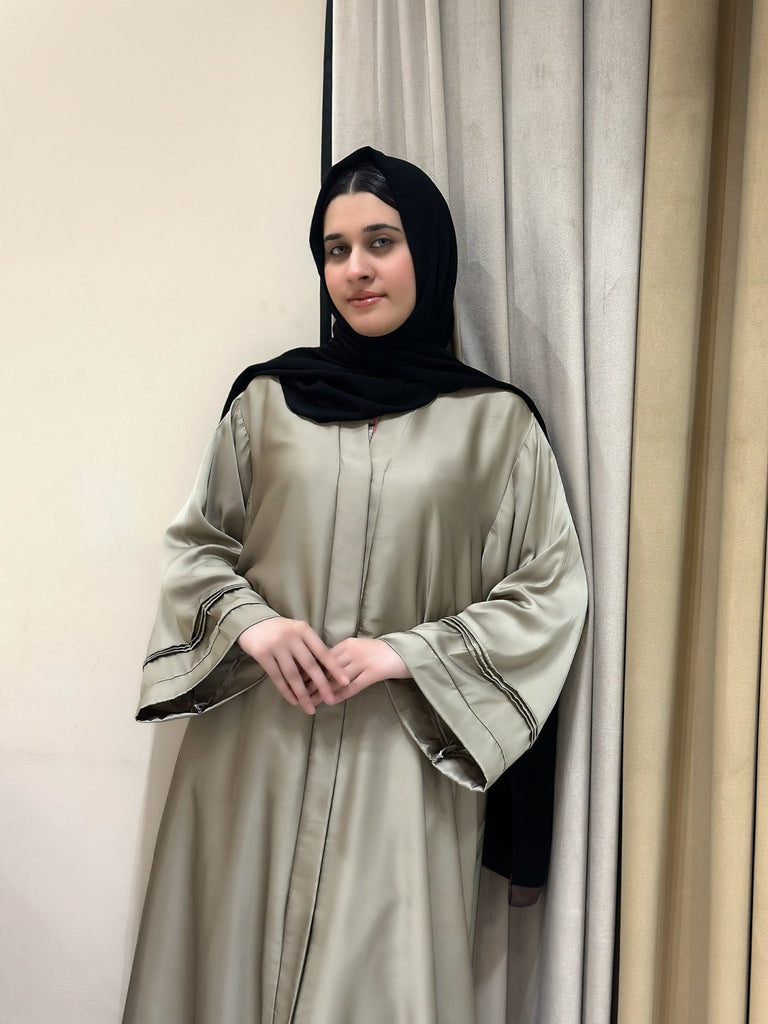 This sophisticated Pista abaya features elegant detailing along the sleeves and edges, adding a refined contrast to its flowing silhouette. The wide, airy sleeves enhance its graceful movement, making it a perfect choice for a timeless and understated look.