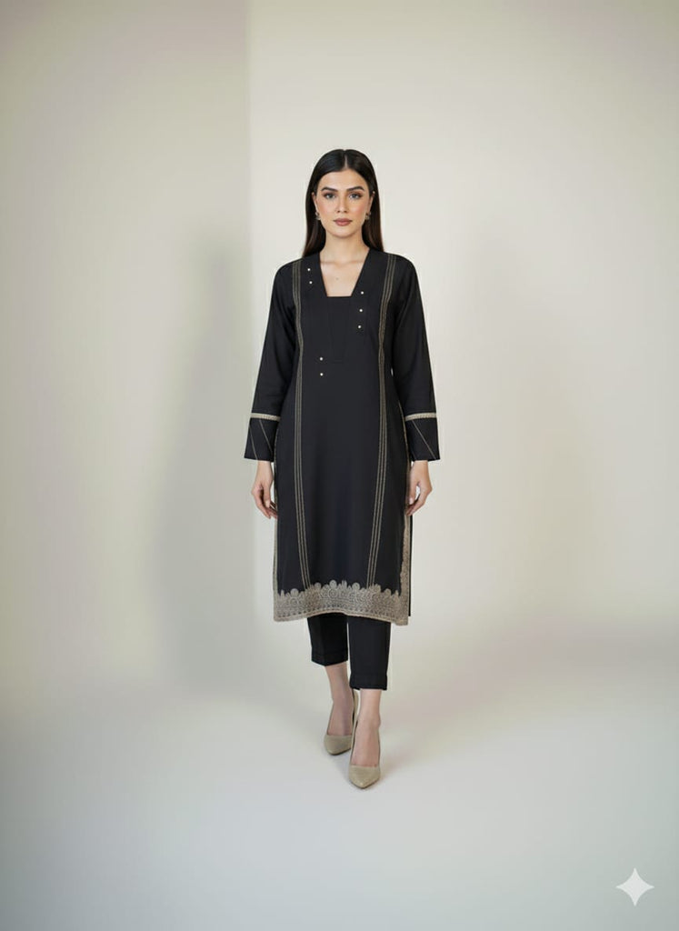 A sleek black kurta featuring metallic embroidery lace along the neckline, front, and cuffs. Finished with a lace-trimmed hem and paired with matching trousers and beige heels. Elegant, refined, and perfect for festive occasions.