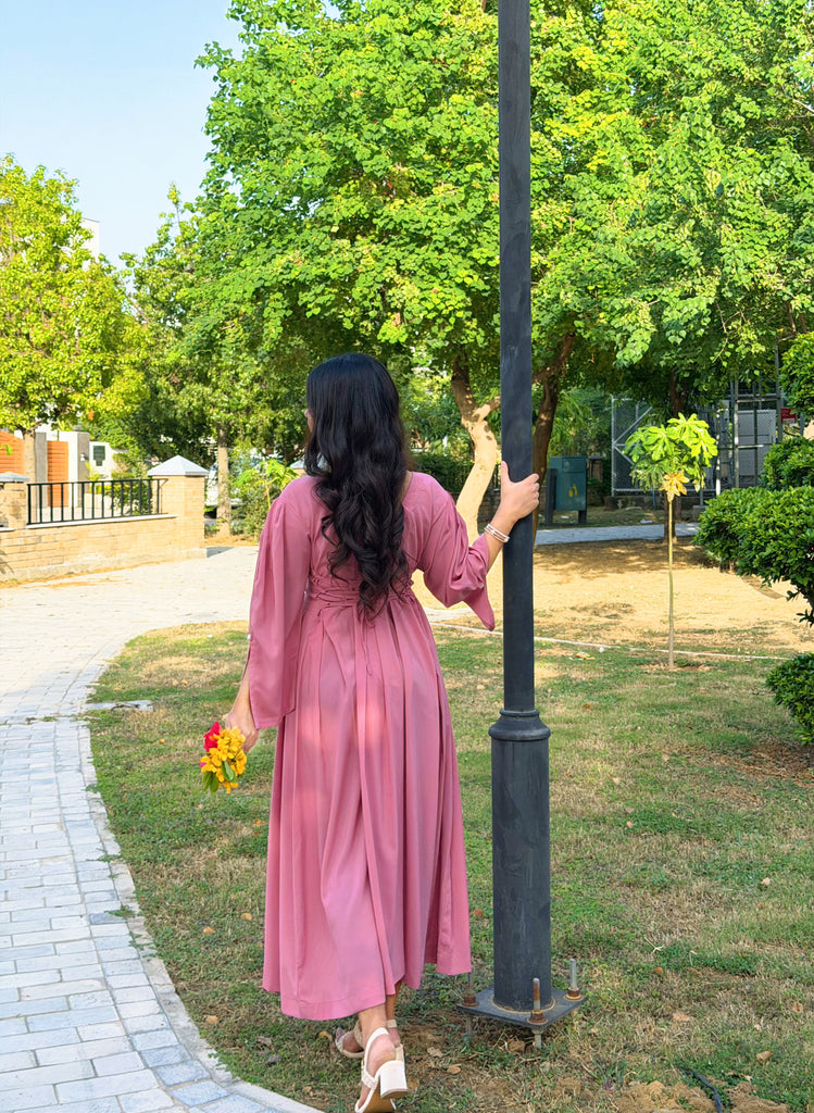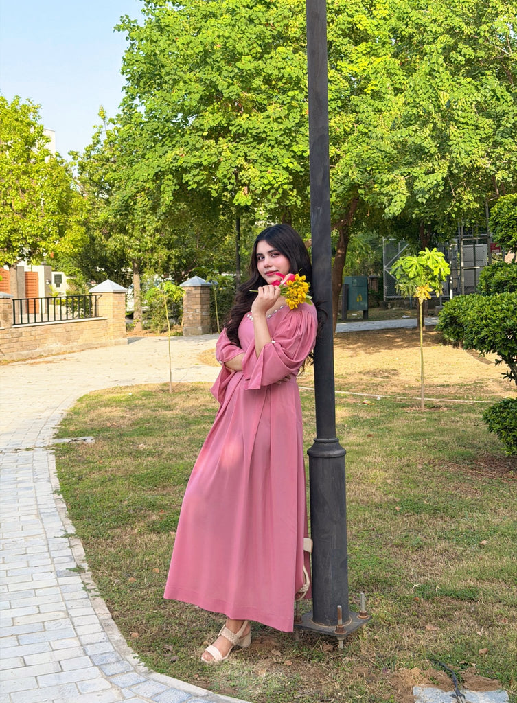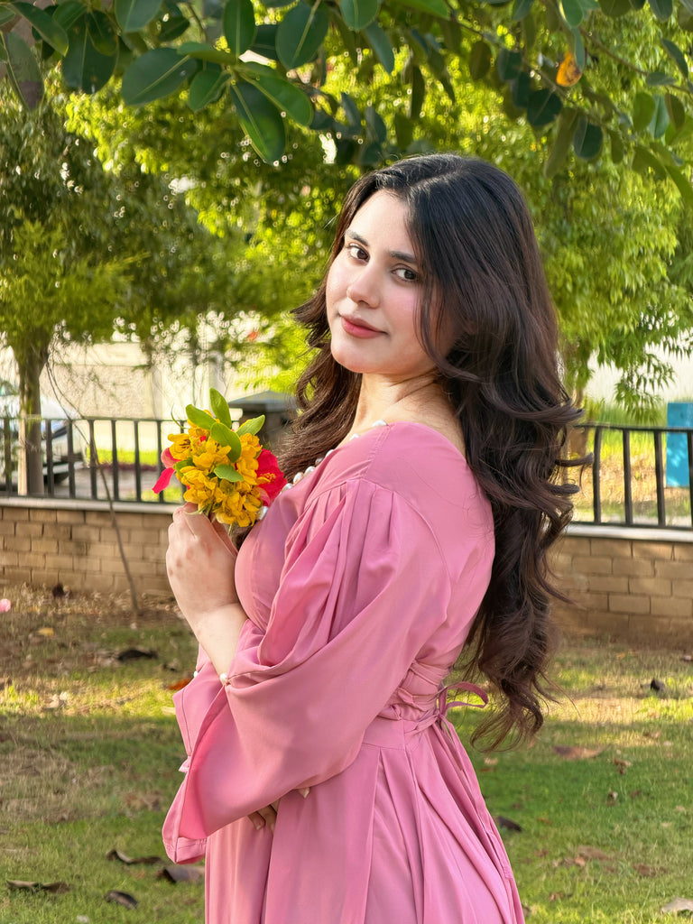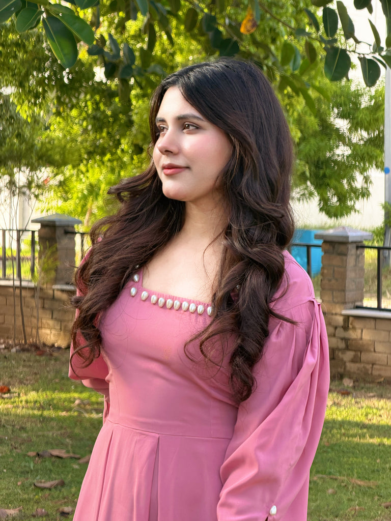 A graceful blush pink frock designed with a square neckline beautifully lined with pearls. The soft, flowy fabric and puffed sleeves create an effortlessly elegant look, while the fitted waist adds a flattering touch.
