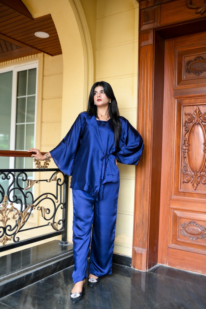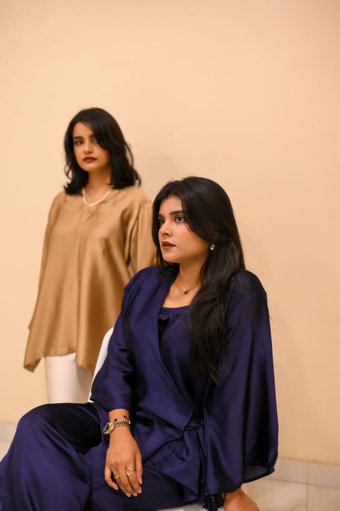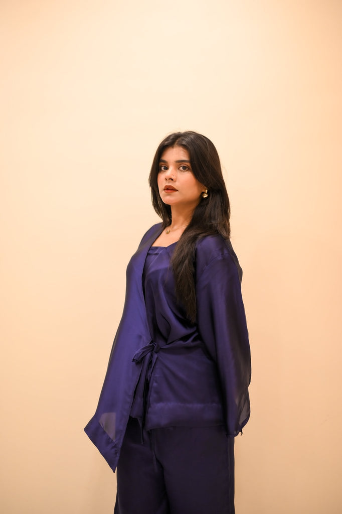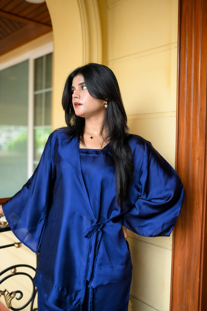 Unveil your inner muse with Midnight Whisper, a two-piece silk ensemble that speaks in tones of elegance and allure. The wrap-style top, designed with wide sleeves and a self-tie sash, sculpts the waist while offering graceful movement. Paired with matching wide-legged trousers, this set is crafted in a rich midnight blue silk that shimmers subtly under light—perfect for evening affairs, formal gatherings, or elevated daywear.