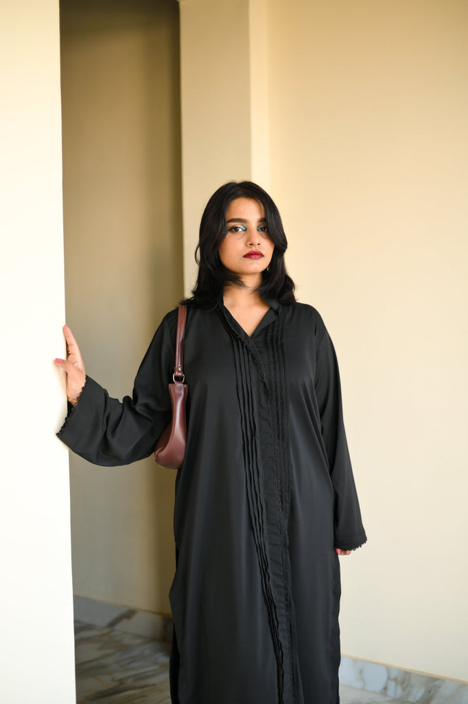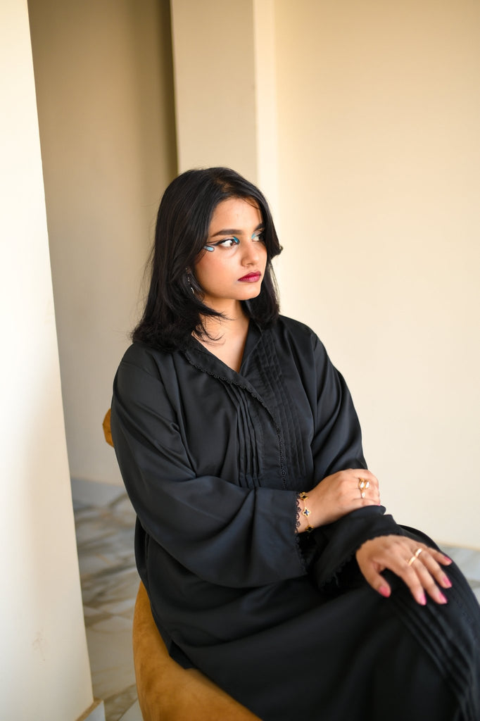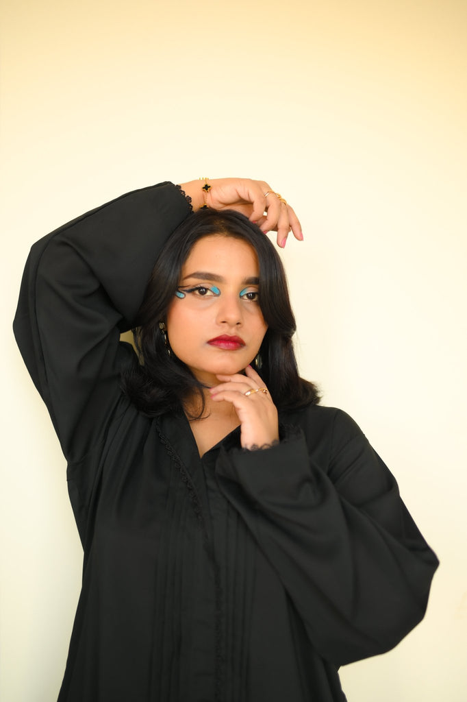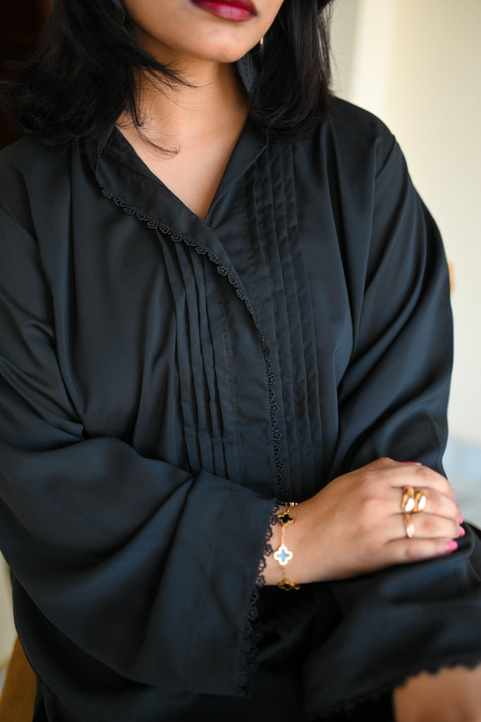 Noir Silhouette is where minimalism meets movement. This two-piece outfit features a long black tunic with pleated sleeve detailing and matching trousers with soft pleats that add depth and dimension. Crafted from imported crystal Georgette, the fabric offers a gentle shimmer and fluid drape, making it ideal for both formal settings and elevated everyday wear.