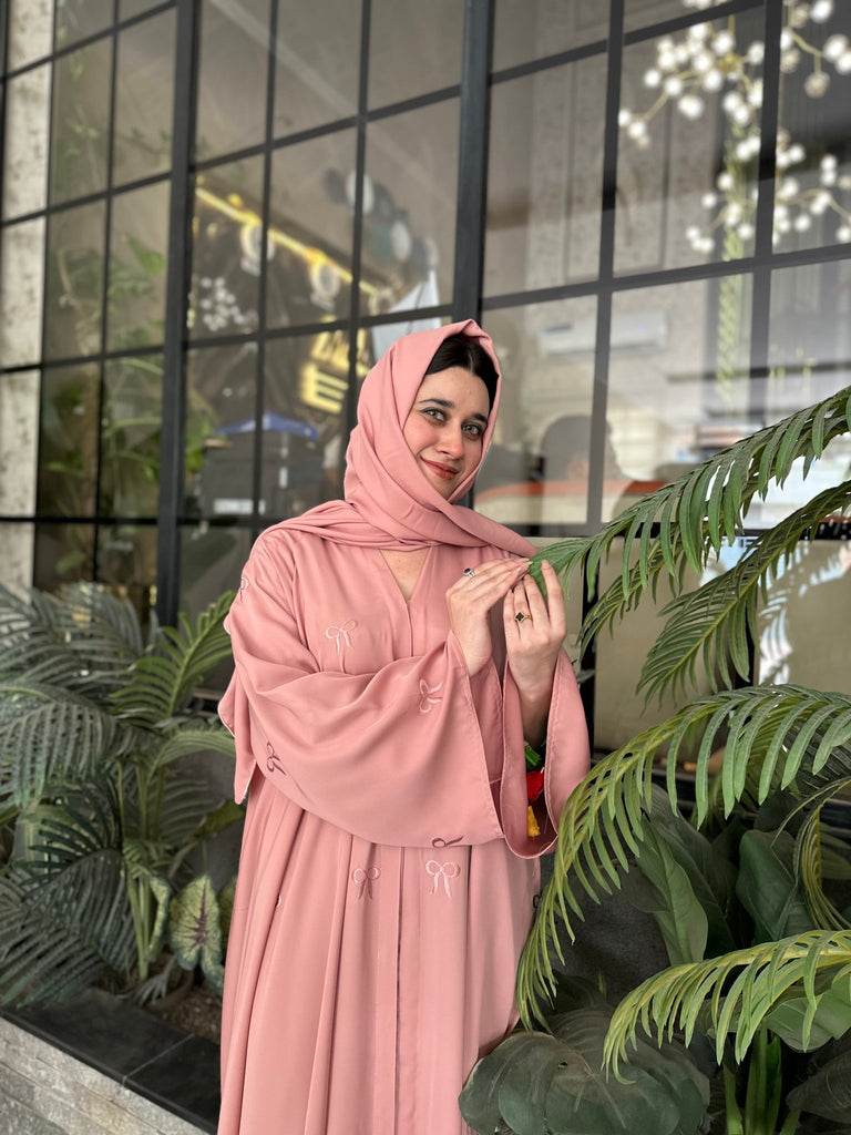 A perfect fusion of grace and femininity, this Blush Bow Elegance Abaya is designed for those who appreciate subtle charm with intricate details. Crafted in a soft, rosy pink hue, the abaya features delicate bow embroidery that cascades along the front and sleeves, adding a refined yet playful touch. The matching hijab carries the same elegant embroidery, creating a cohesive look that radiates sophistication. Made from lightweight, flowing fabric, this set ensures comfort and effortless movement while maintaining a polished appearance. Whether for formal gatherings or everyday elegance, this abaya is a timeless addition to any modest wardrobe.