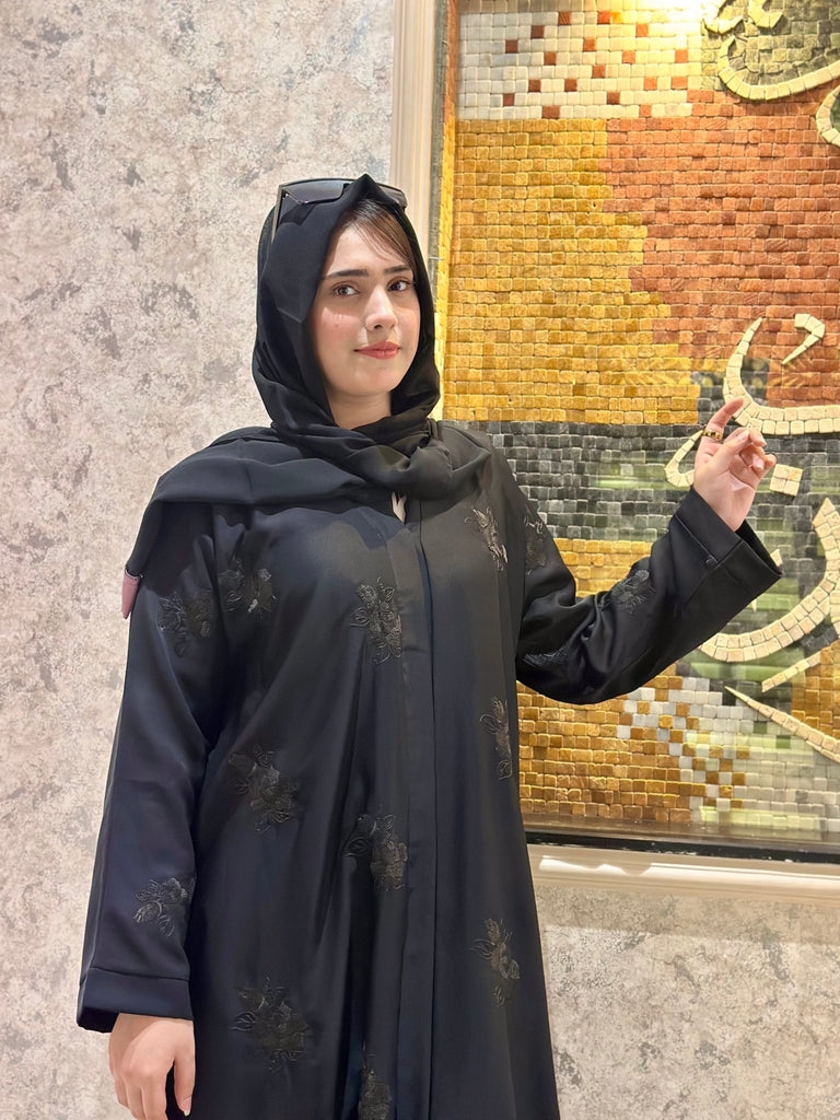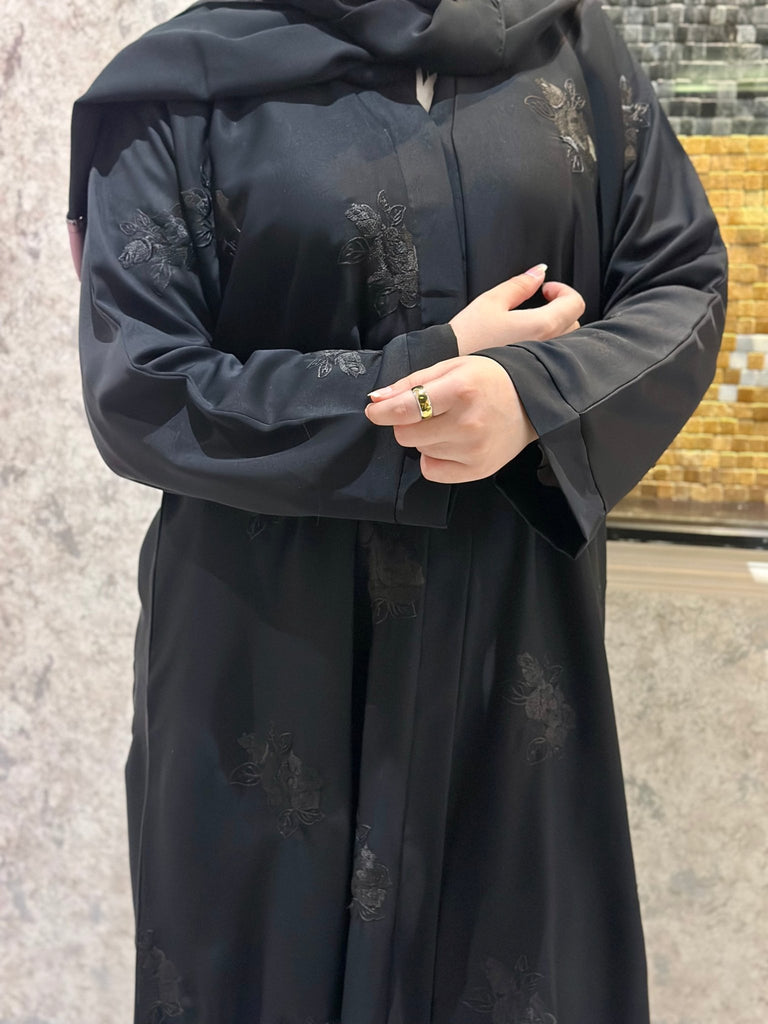 This abaya showcases delicate embroidery across the fabric, adding a refined and artistic touch. Its flowing silhouette enhances grace and sophistication, making it a timeless wardrobe piece.
