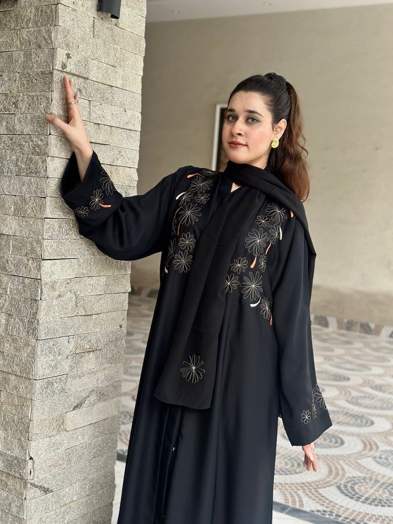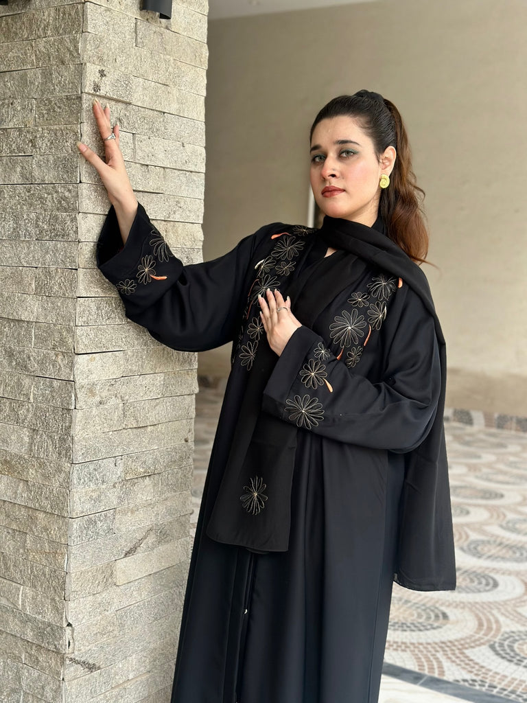 Immerse yourself in elegance with the Midnight Bloom Embroidered Abaya, a masterpiece crafted from luxurious black nidah fabric. The rich, flowing silhouette serves as the perfect canvas for breathtaking multi-color embroidery that dances along the abaya's front, sleeves, and hemline. Hints of gold, orange, and white floral motifs create a stunning contrast, bringing an exquisite blend of vibrancy and sophistication.