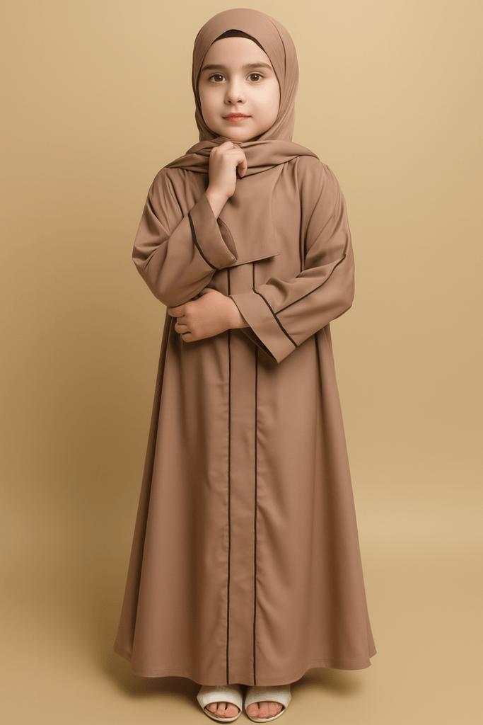 Chic and comfortable, this brown abaya with sleek black piping adds a modern twist to a timeless look — ideal for your little one’s modest wardrobe.