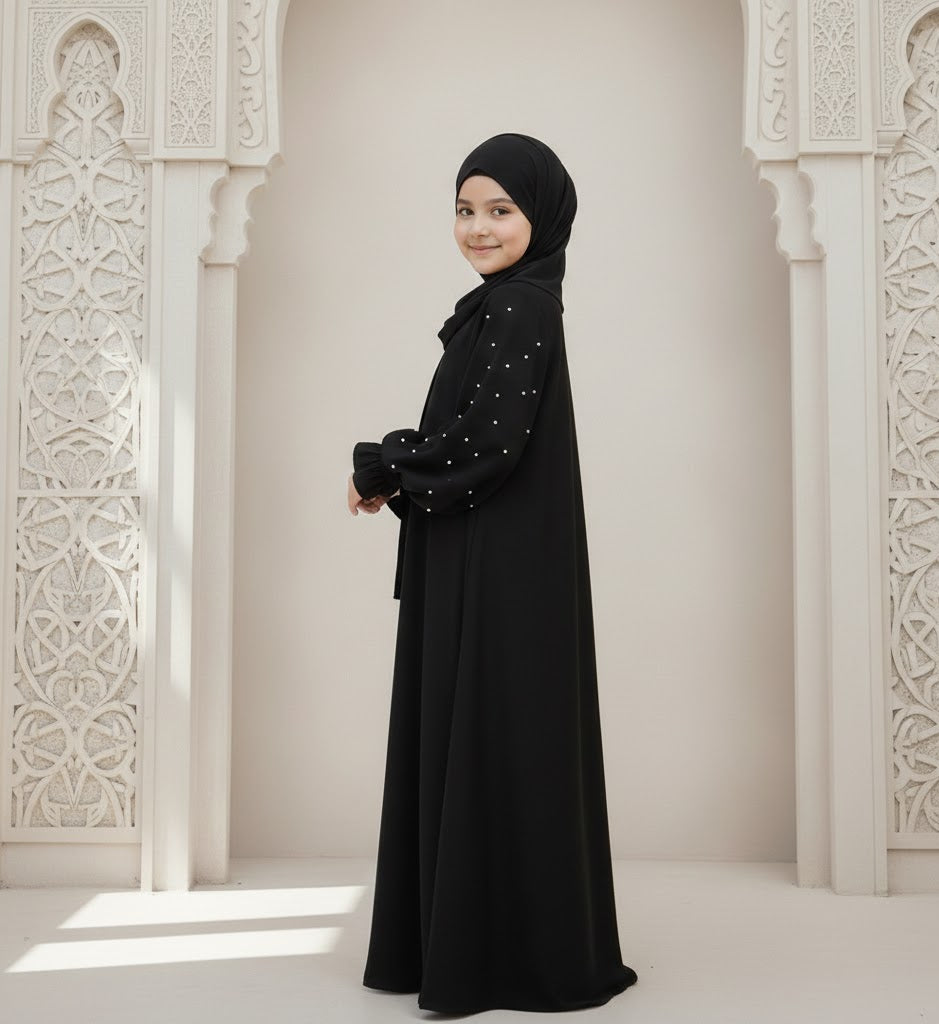 Introduce your child to modest elegance with this stunning black abaya, thoughtfully designed for young wearers. Crafted from quality fabric, this piece features beautifully detailed pearl embellishments along the sleeves that add a touch of sophistication. The flowing silhouette provides comfort and ease of movement, while the full-length design ensures complete coverage. Perfect for special occasions, religious celebrations, or everyday wear, this abaya combines traditional modesty with contemporary style. An essential addition to any child's modest wardrobe.