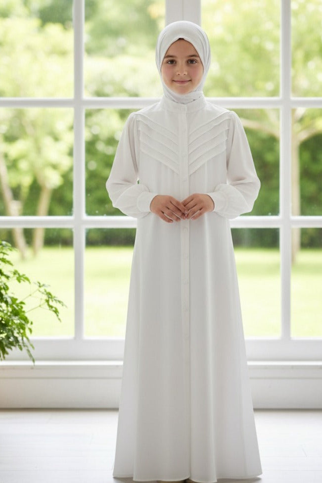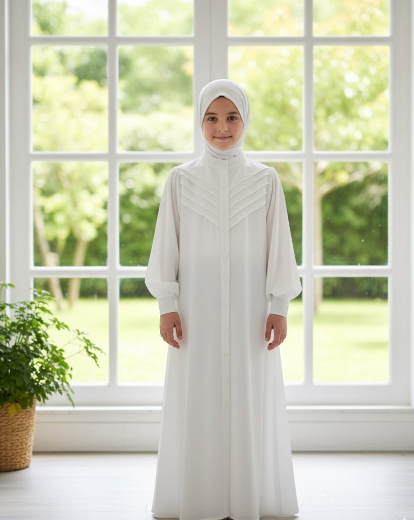 Introducing our Little Pearl Abaya — a beautifully crafted kids’ abaya designed for moments that call for purity, elegance, and charm. Made in a soft, radiant white shade, this abaya features delicate layered pleats on the bodice and a full button-down front for easy wear and a polished look.
