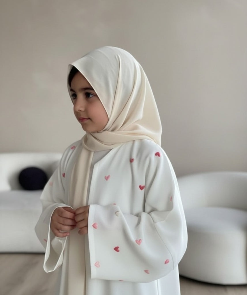 A stunning black abaya adorned with tiny blush-pink heart accents, creating the perfect blend of elegance and sweetness. Its flowy design and comfortable fit make it ideal for special occasions, family gatherings, or Eid celebrations. Paired beautifully with a cream hijab and a soft pink bag for a complete, charming look.