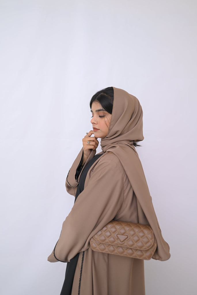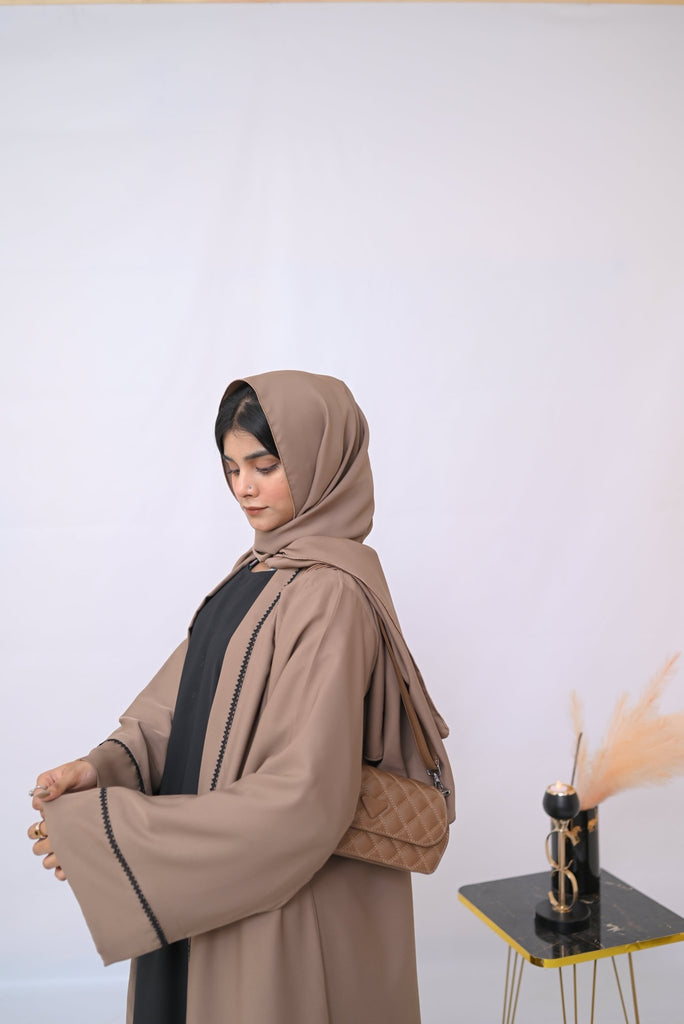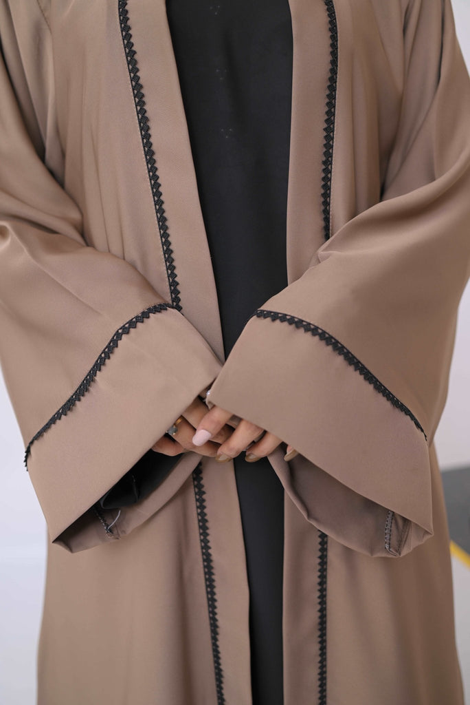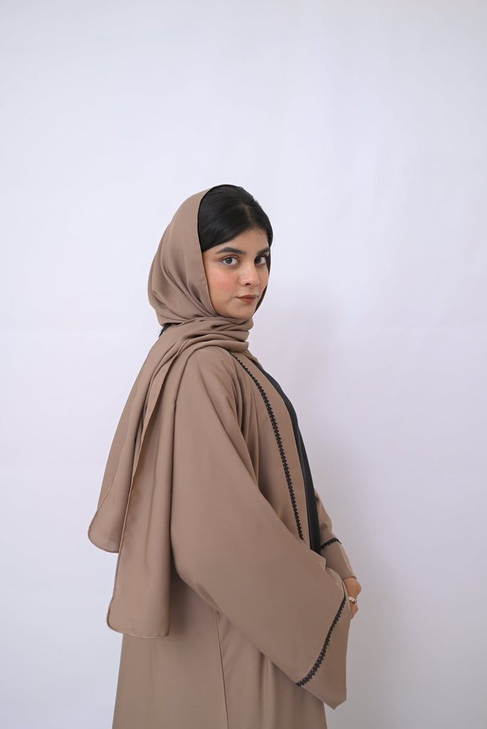Elevate your wardrobe with our elegant color-block abaya, a perfect blend of tradition and modernity. This abaya features a sophisticated design with black and beige panels, creating a striking contrast that is both timeless and contemporary. The beige section flows smoothly, while the black piping along the edges adds a touch of refinement and elegance.