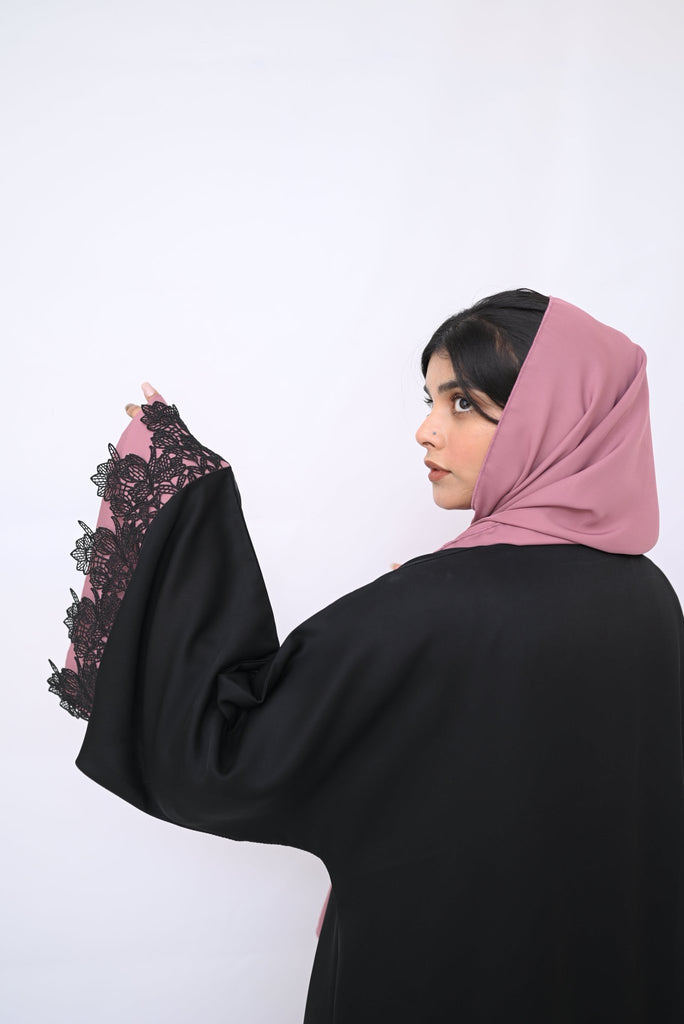 Elevate your wardrobe with our sophisticated abaya, designed to offer both elegance and comfort. This full-length abaya features a flowing silhouette that drapes gracefully, complemented by wide sleeves adorned with intricate lace trim and floral accents. The lace detailing on the sleeves adds a touch of femininity and style, making this abaya perfect for any occasion.