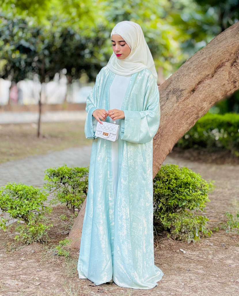 Radiating elegance with every step, this light blue shimmer Velvet abaya features a fluid silhouette and subtle shine that catches the light beautifully. Paired with white hijab, it’s the perfect blend of tradition and modern sophistication for serene outdoor moments.