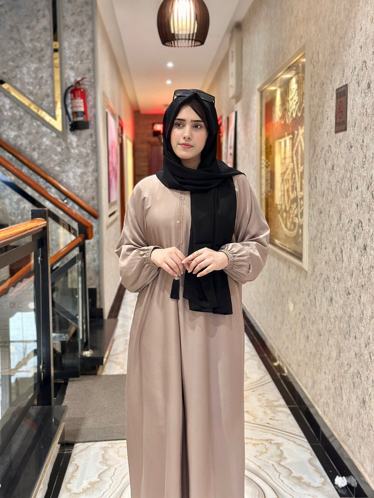 This abaya features sleek panel detailing that enhances its refined and graceful look. The flowing silhouette adds a touch of sophistication and timeless charm.