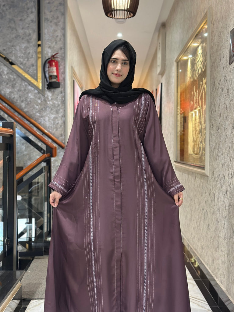 This abaya features sleek contrast accents that create a refined and graceful look. The flowing silhouette adds a touch of sophistication and timeless charm.