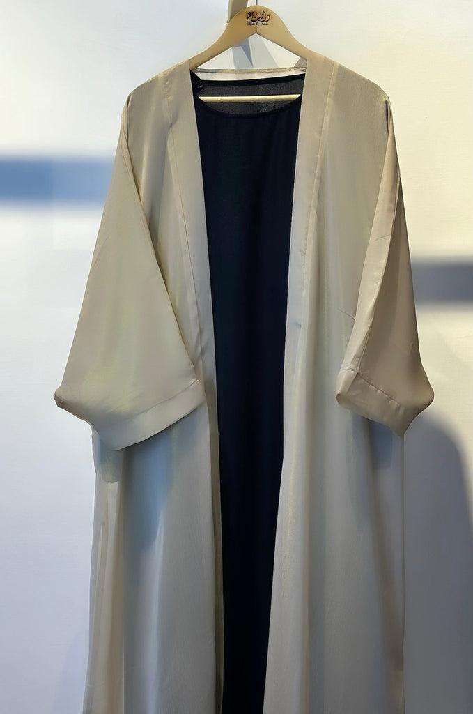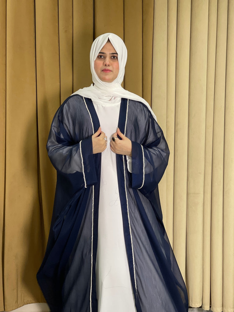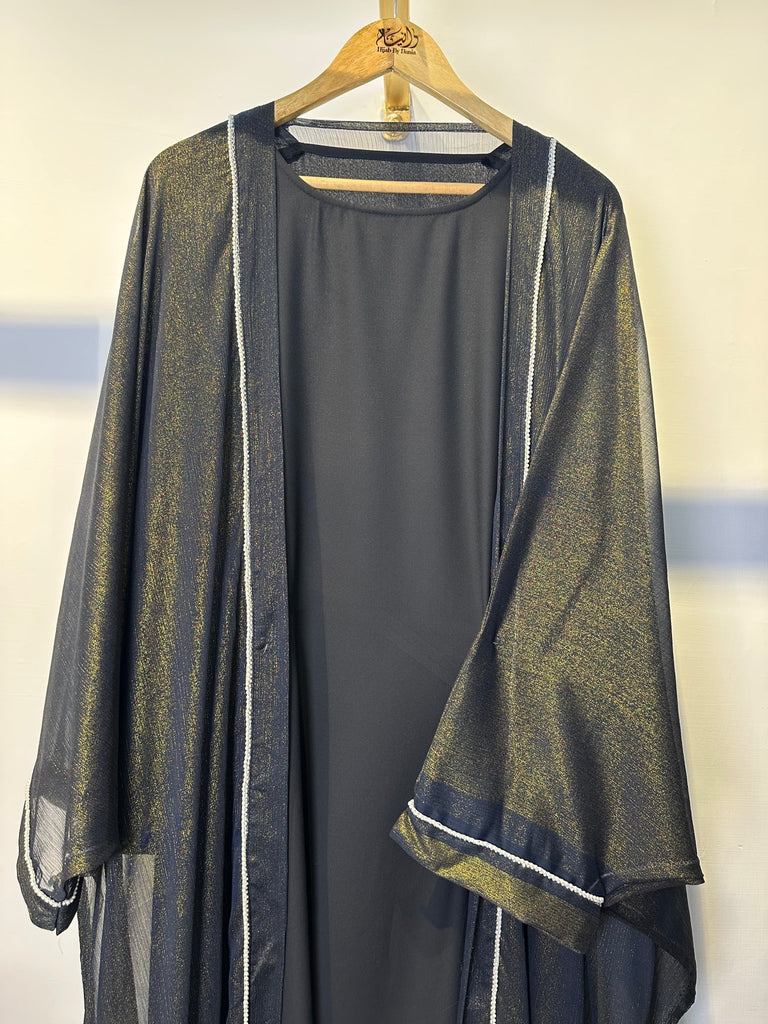 Elevate your elegance with this black abaya, featuring a sheer overlay adorned with subtle gold accents and a delicate white lace. Its graceful flow and refined details make it a perfect blend of sophistication and charm. Ideal for an effortlessly chic look!
