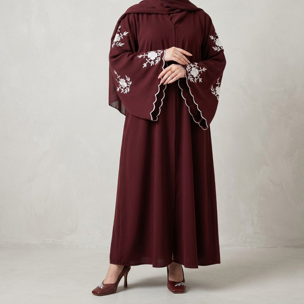 The Embroidered Scallop Bell Abaya features a front‑open, relaxed silhouette that offers full coverage with effortless drape and movement. Wide bell sleeves are the focal point, finished with wavy scalloped edges and floral vine embroidery along the sleeve panels for a delicate, handcrafted look. The overlapping V‑neckline keeps the front tidy while the straight, floor‑length cut ensures a classic modest shape. Made from lightweight, breathable fabric, it’s comfortable for long wear at events, Eid, or formal evenings. The wrinkle‑resistant, easy‑care material maintains a crisp finish and elegant fall after every wash. Pair it with a plain inner dress, matching hijab, and statement heels for a graceful, contemporary outfit.