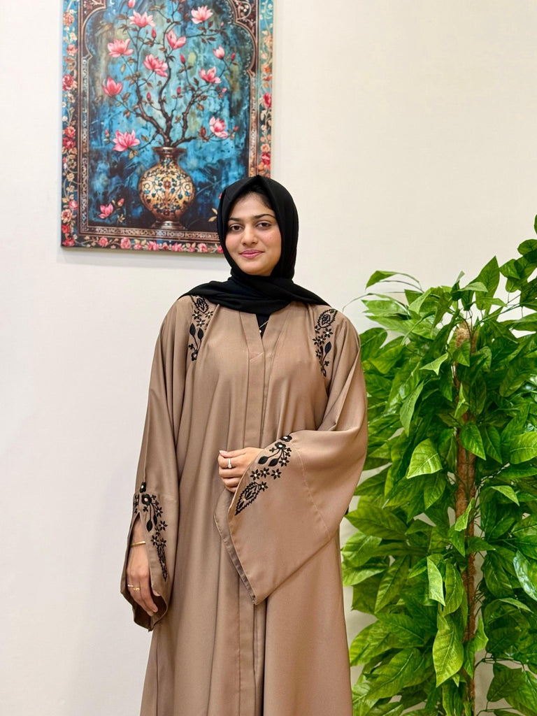 - Description: A sand-colored abaya featuring delicate black floral embroidery along the sleeves. The soft and flowing fabric complements the intricate floral design, creating a graceful and elegant look.