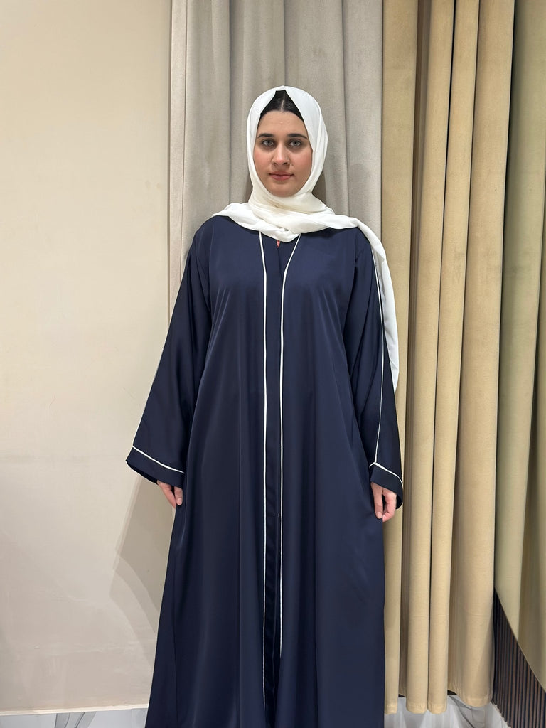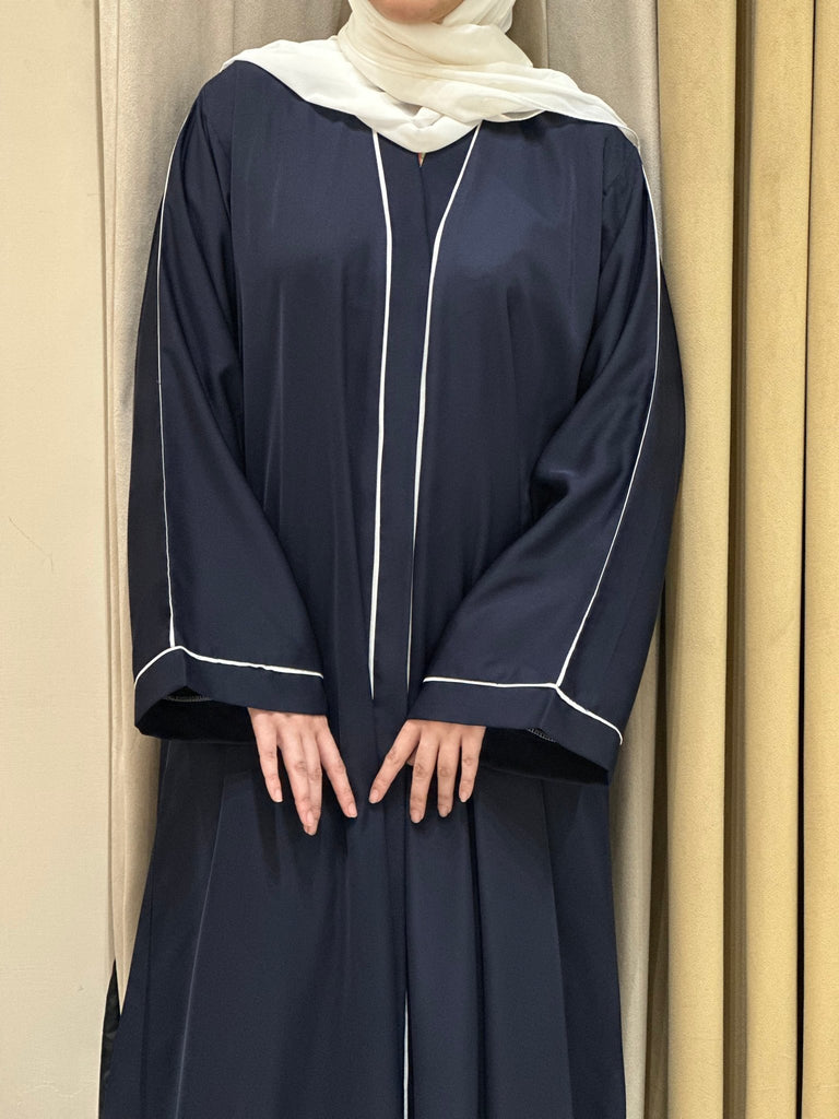 - Elegant navy blue abaya with delicate white piping for a sophisticated look.