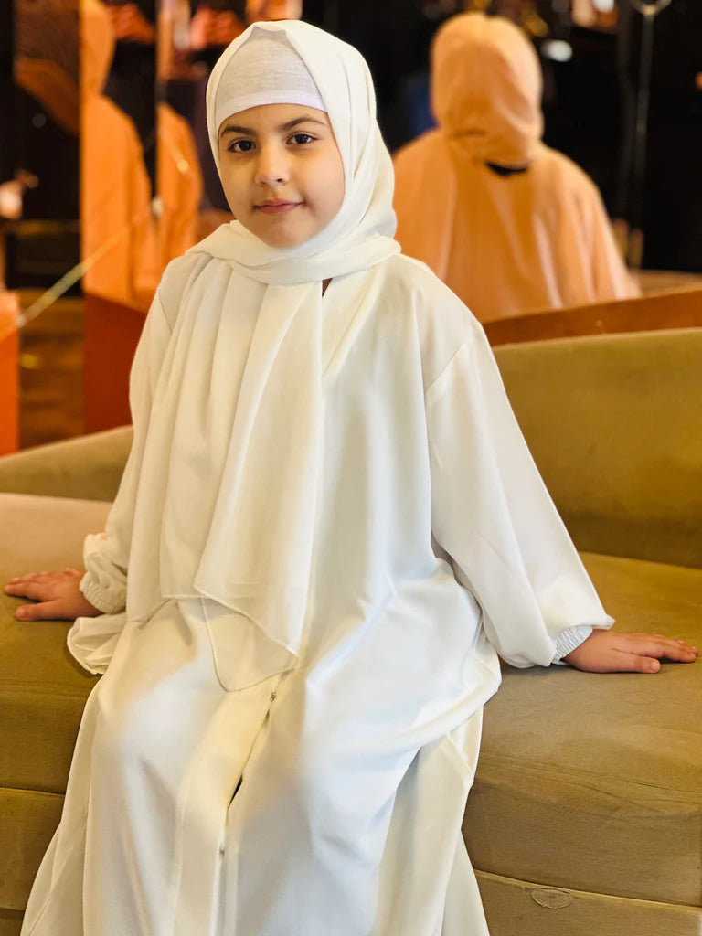 Introduce your little one to timeless modest fashion with our White Basic Abaya, designed to combine elegance, comfort, and cuteness in one perfect outfit. Made in a white shade, this abaya features soft pleated detailing on the bodice and delicate ruffle accents on the shoulders and sleeves—adding a sweet, feminine touch kids love.