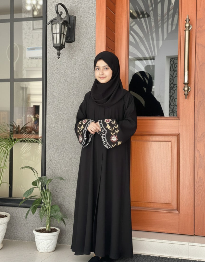 The Mini Bloom Elegance Embroidered Abaya by Hijab by Dania is designed specially for little girls who love modesty with a touch of charm. Crafted in classic black, this abaya features beautifully detailed floral embroidery on the sleeves, adding a soft and graceful pop of color to the overall look.