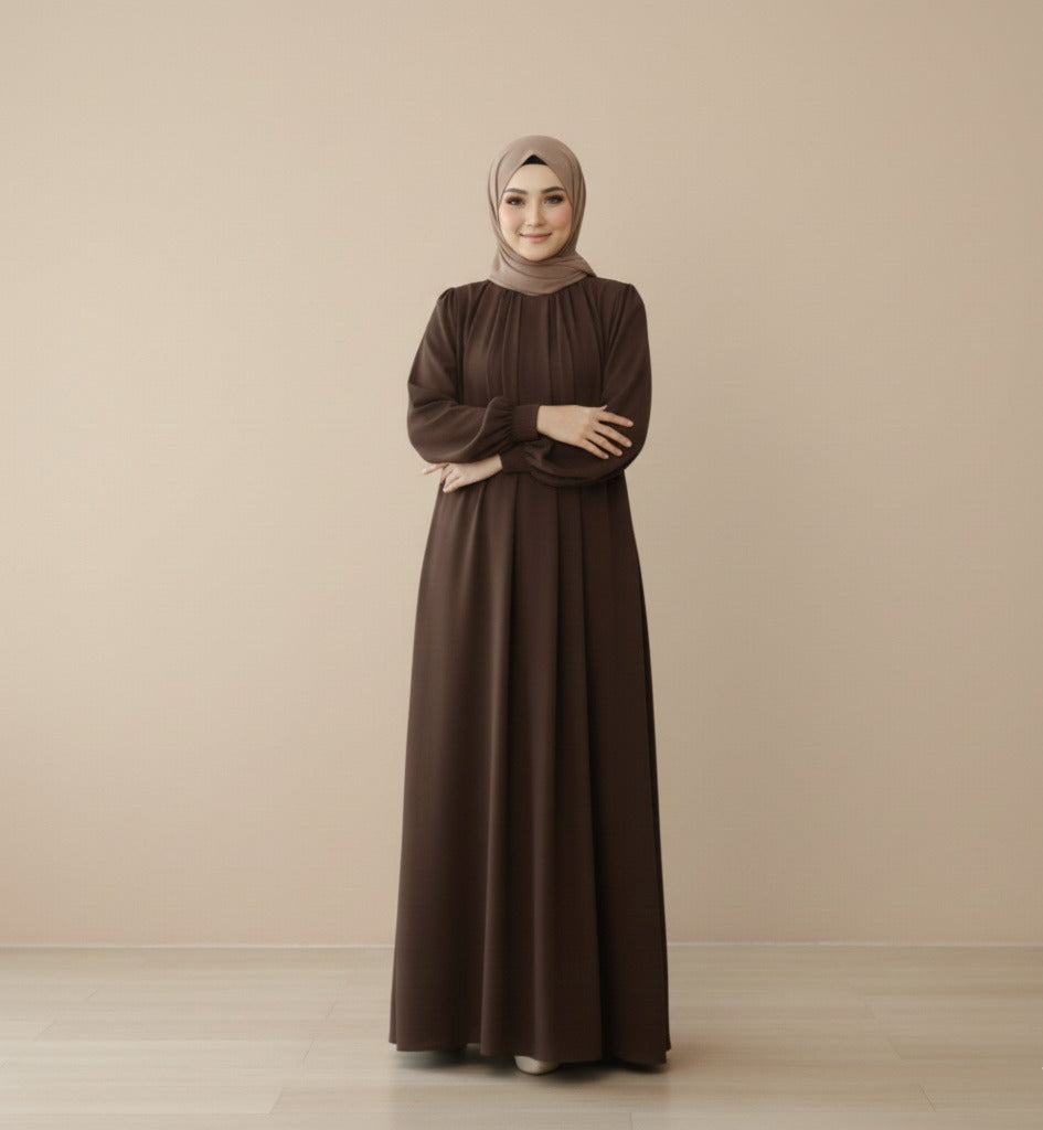 he Mocha Grace Pleated Abaya by Hijab By Dania is the perfect blend of sophistication and softness. Designed in a rich mocha brown shade, this abaya features delicate pleats along the bodice that add texture, flow, and a refined silhouette.